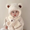 Este gorro de pelúcia estilo urso com cachecol integrado é ideal para proteger a cabeça, pescoço e orelhas das crianças nos dias mais frios. Com tecido grosso, macio e à prova de vento, proporciona máximo conforto e isolamento térmico.